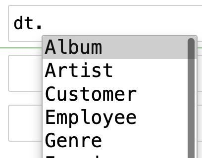 ArtistId: int | None = NoneBecause dataclass() is dynamic, you won’t get auto-complete in editors like vscode – it’ll only work in dynamic environments like Jupyter and IPython. For editor support, you can export the full set of dataclasses to a module, which you can then import from: